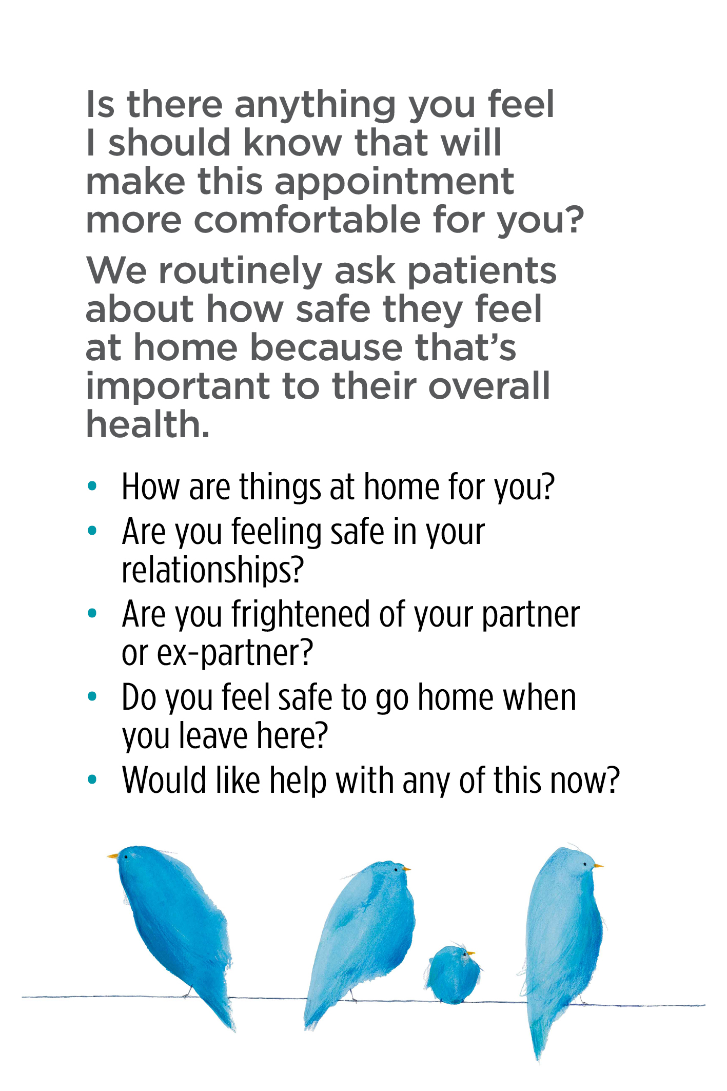 They include posters to promote the hospital as a safe place for women to discuss family violence, posters for staff to prompt them to ask about family violence, and other resources such as palm cards and buttons. Hospitals can add their corporate logos to the materials. These materials should only be displayed once the SHRFV training has been delivered.