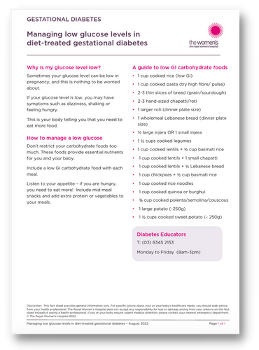 Sometimes your glucose level can be low in pregnancy, and this is nothing to be worried about. If your glucose level is low, you may have symptoms such as dizziness, shaking or feeling hungry. This is your body telling you that you need to eat more food.